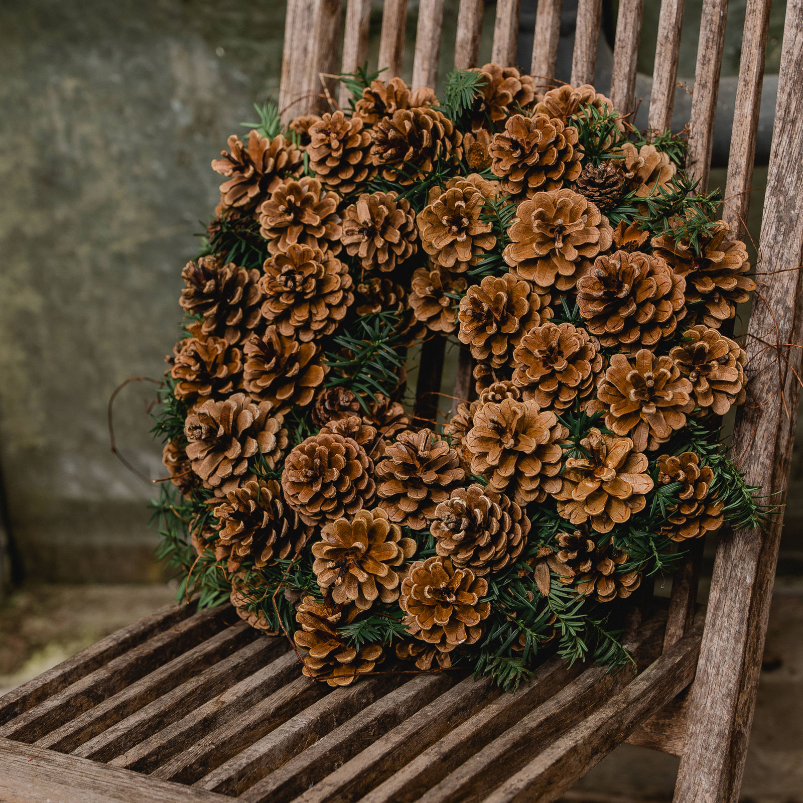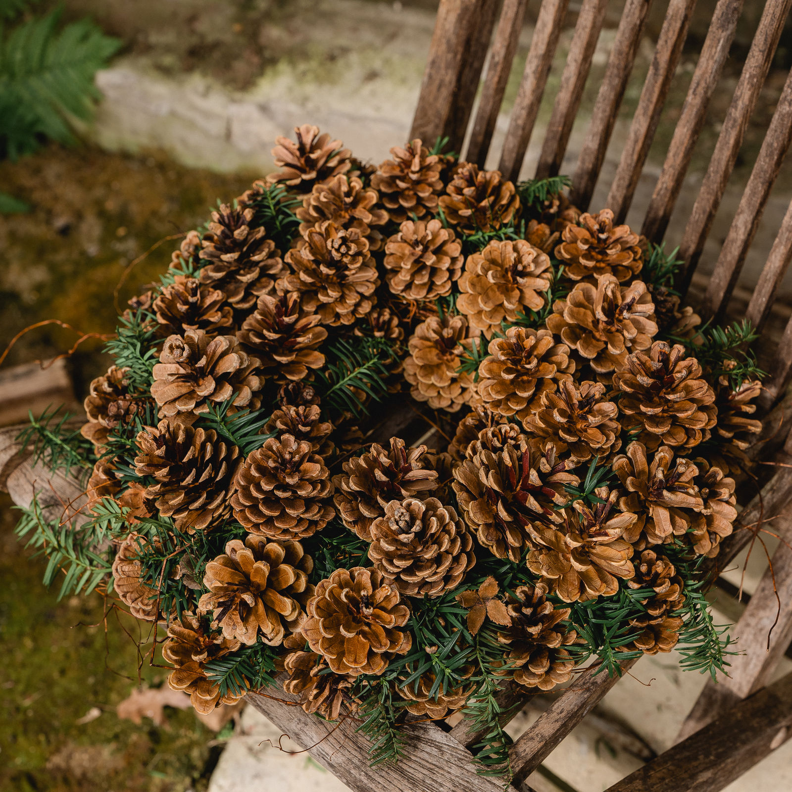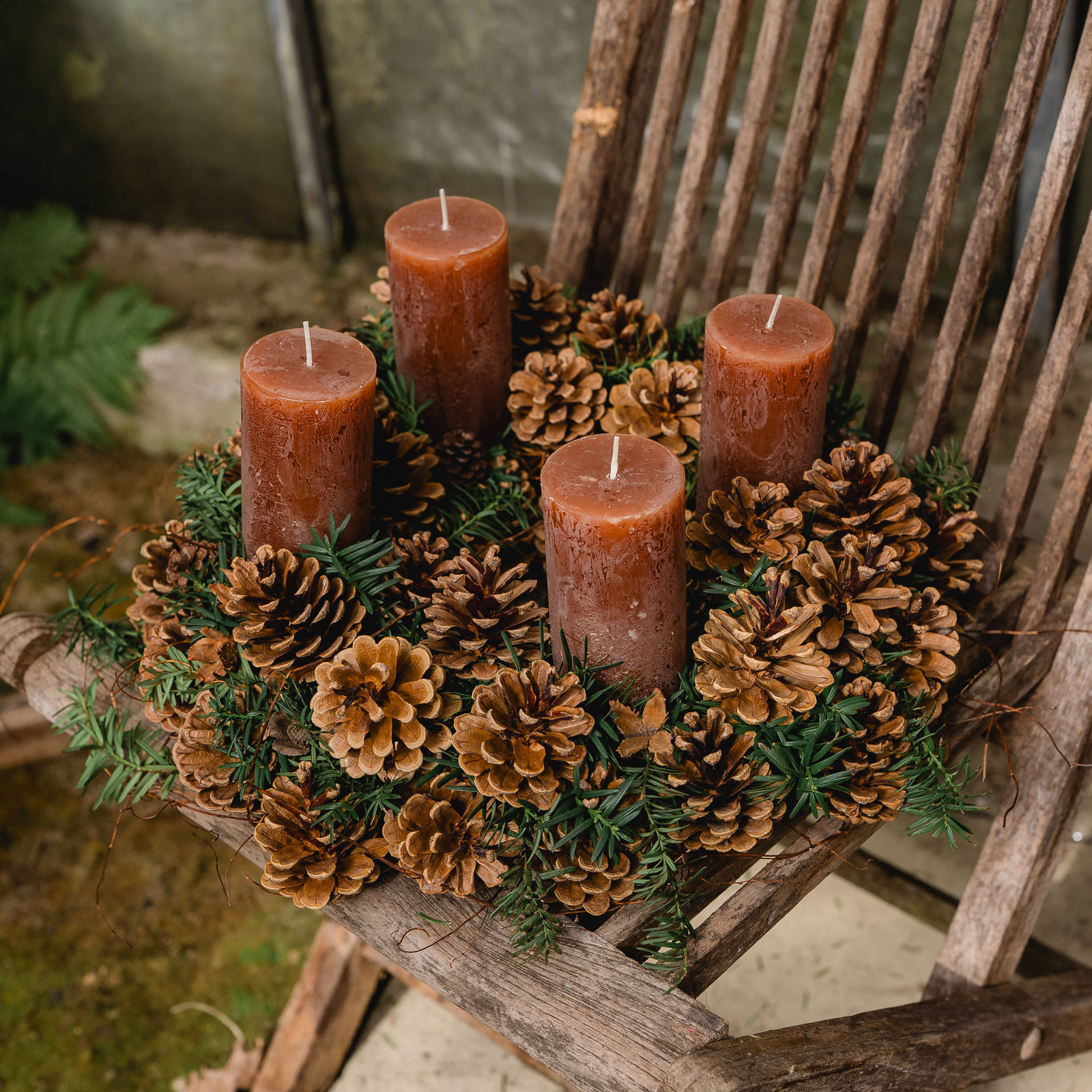 Wild und struppig gebundener Adventskranz bestehend aus Taxus und Ranken, welcher mit Schwarzkieferzapfen veredelt ist.