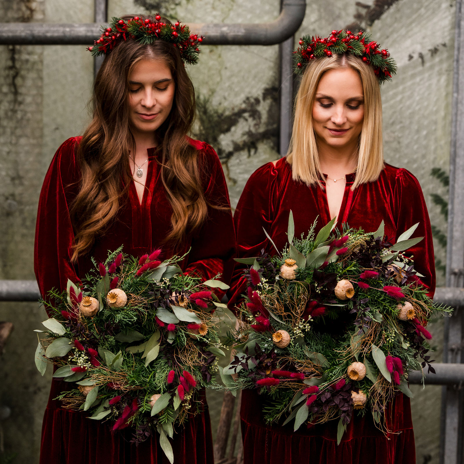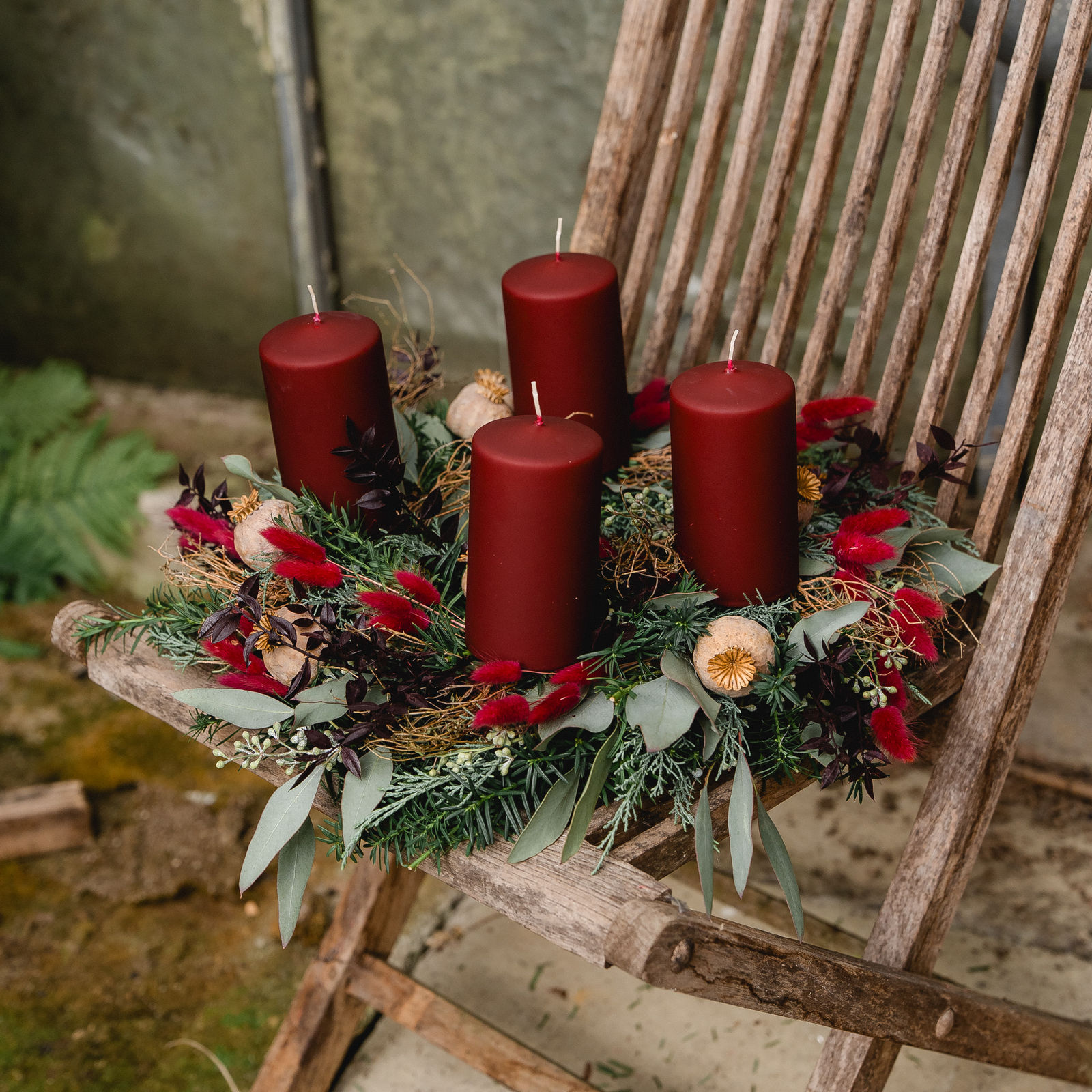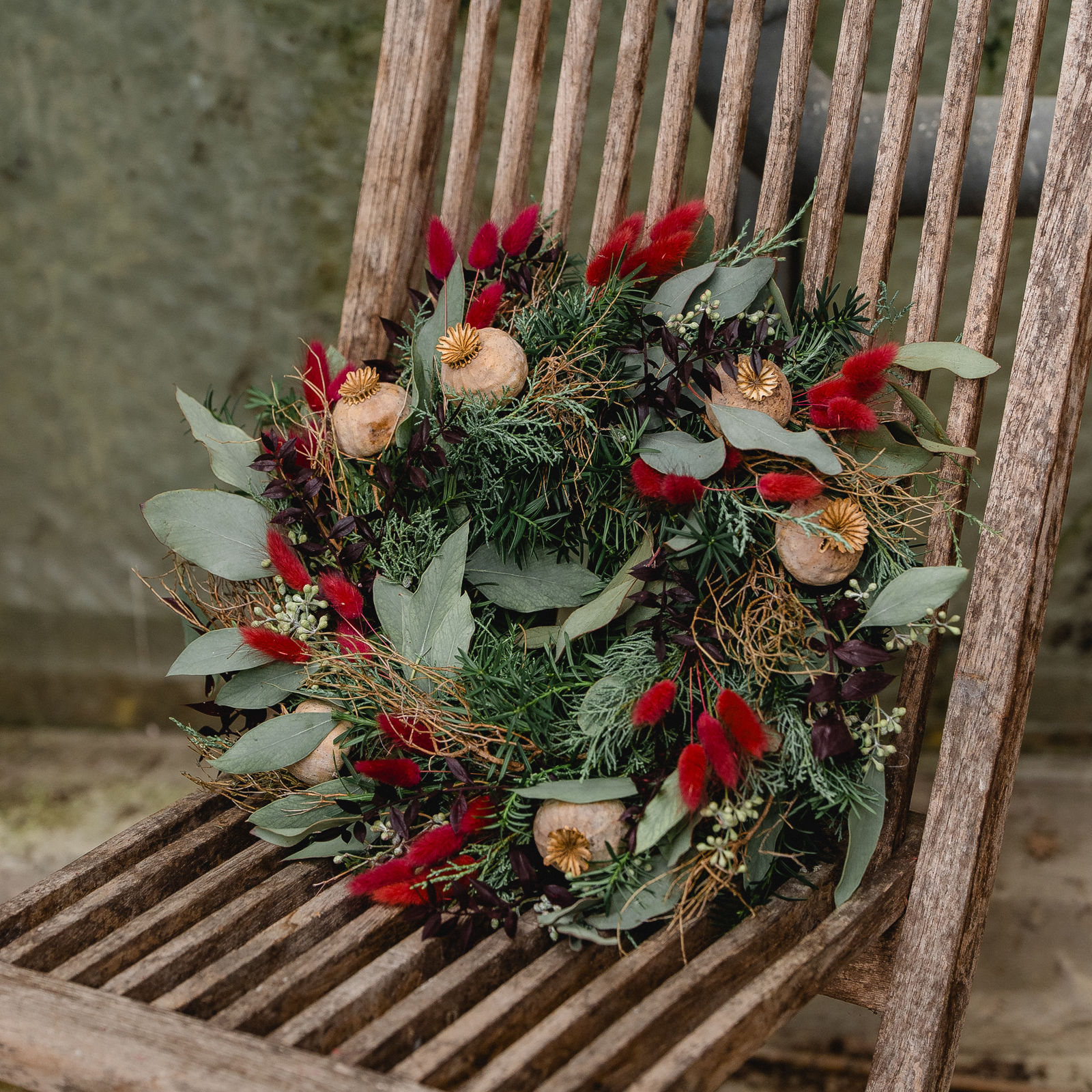 Ein wild und natürlich gebundener Adventskranz aus unterschiedlichem Grün-Mix, rundherum liebevoll mit blumigen Trockenblumen in Rottönen und Mohnkapseln ergänzt.