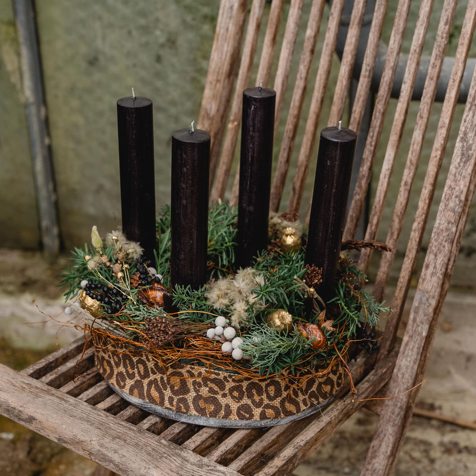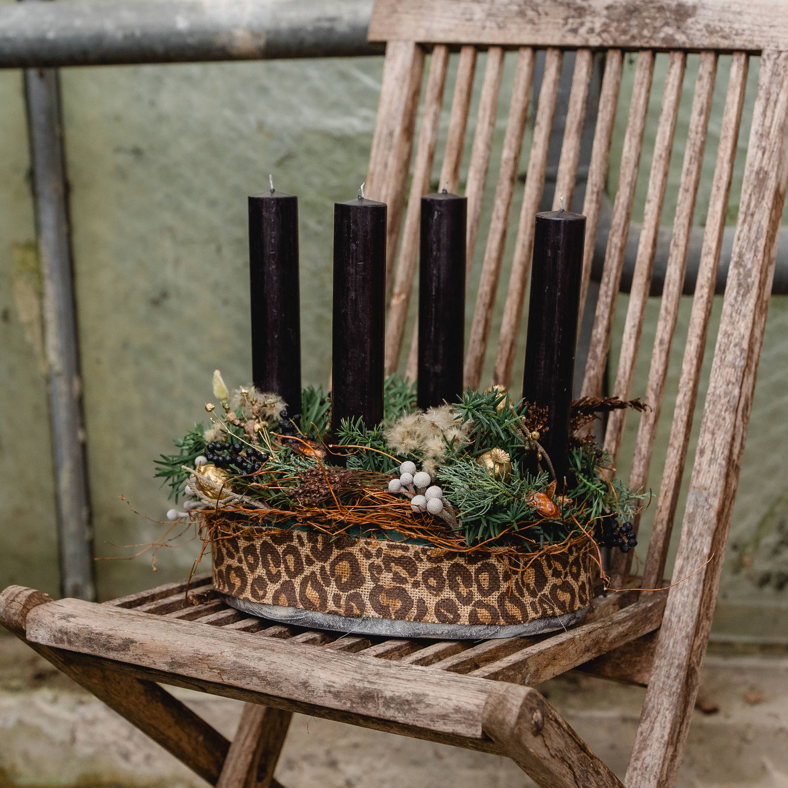 Wild und struppig gebundener Adventskranz aus gemischtem Reisig, mit Trockenblumen in Beige- und Brauntönen, goldenen Mohnkapseln, Baumschwämmen und einem breiten Band im Leo-Look dekoriert.